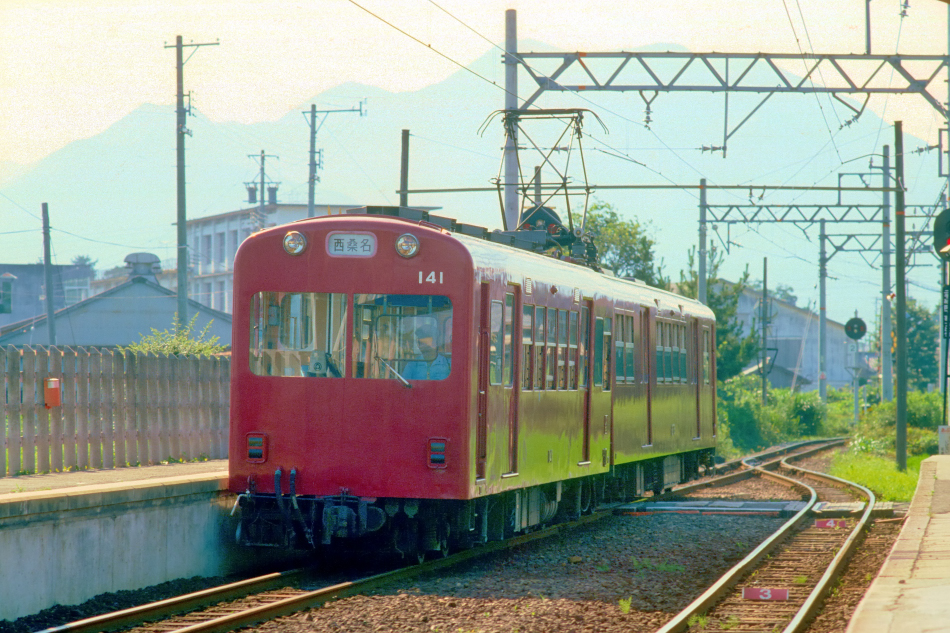 楚原 モ275‐サ201=サ101=ク202 西桑名 近鉄時代の1977年に登場したモ270形275を先頭にした4両編成が北大社に到着。後ろ3両は200系連接車で付随車化されており,西桑名に向かう際はこのモ275を先頭のク202から間接制御する形で運転されます。モ270形登場以前は終端駅でモニ220形を機関車の如く先頭に回して牽引していました。 |