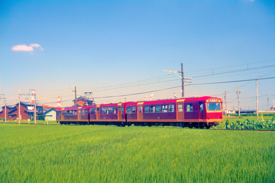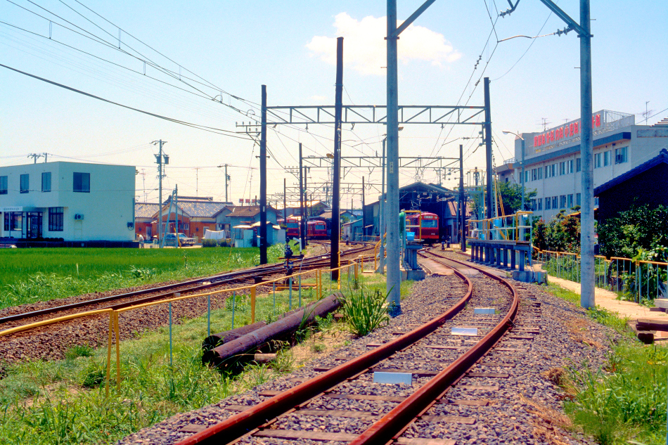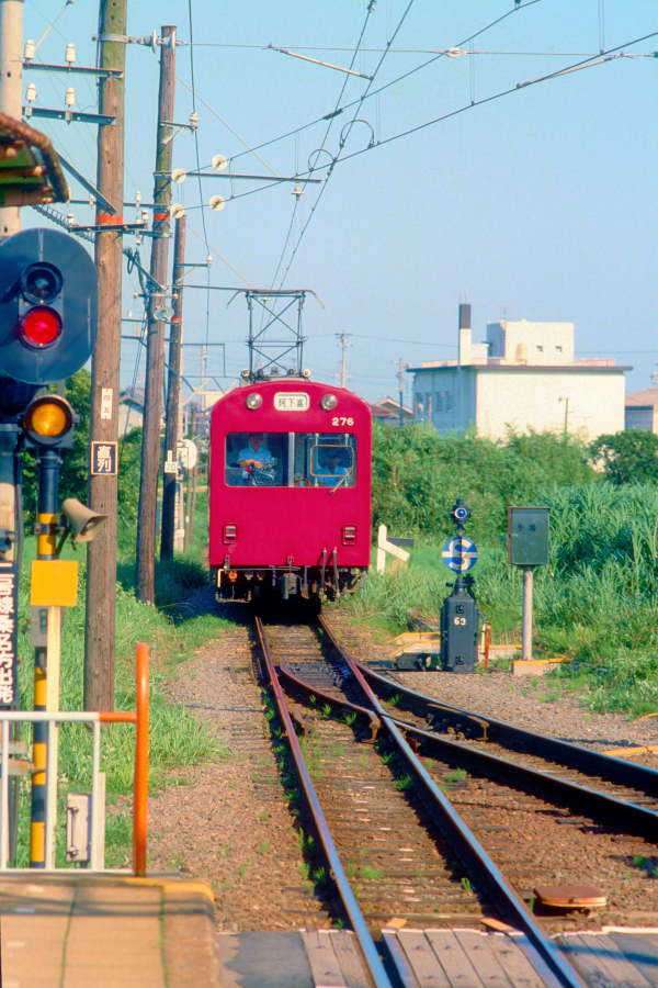 楚原 モ275‐サ201=サ101=ク202 西桑名 楚原折り返し,西桑名行きとなる275F。このク202,サ101,サ201の3両は1959年に三重交通が湯の山温泉観光用として製造した3車体4台車連接車で,正面は非貫通の湘南形となっています。製造当初は201と202はM車でしたが1971年に電装解除され全車付随車となってモニ220形が牽引する形で運用されていました。1977年にモ270形と総括制御できるように制御車に再改造されク202となりました。 ![]() |