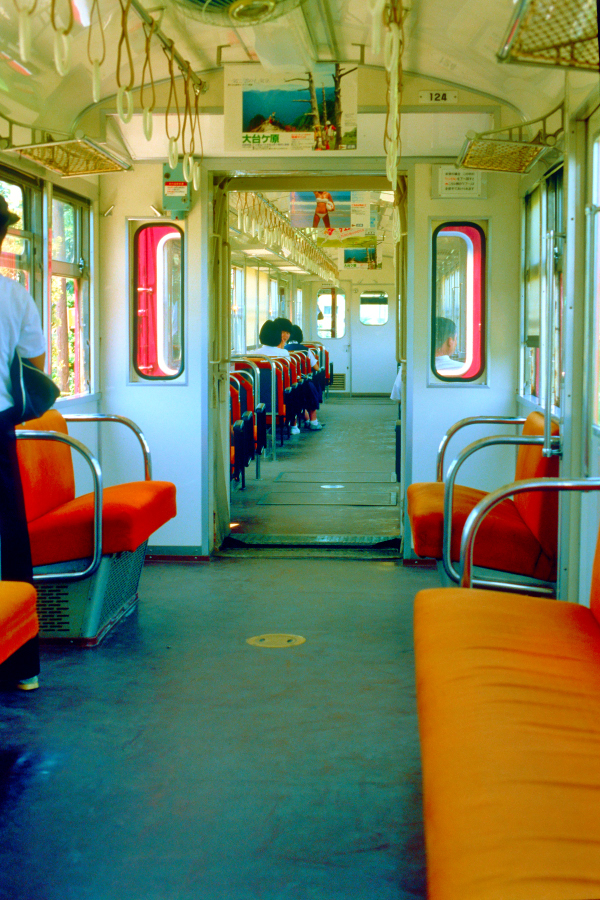 | No.103‐05 1985年7月15日 サ120形 サ124他 3両 内部行 近鉄内部線内 四日市 モ264‐サ124‐ク114 内部 260系組み込みのためサ130形から更新改造されサ120形サ124に改番された中間車に乗車し,車内から四日市方のモ264を眺めたところです。車両の幅がかなり狭く妻部の窓は縦長形状になっています。貫通路の幅は比較的広くなっています。祝日に国旗を掲揚していましたが,貫通路の上は広告に被るためか左側の窓上に金具が設けてあります。 |