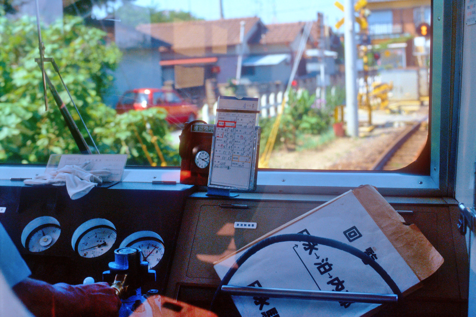 四日市 モ264‐サ124‐ク114 内部 日永に向け減速中のモ264運転台。前方に日永駅手前にある踏切が見えています。運転時刻表には日永停車14時18分15秒‐40秒と記載されています。 |
