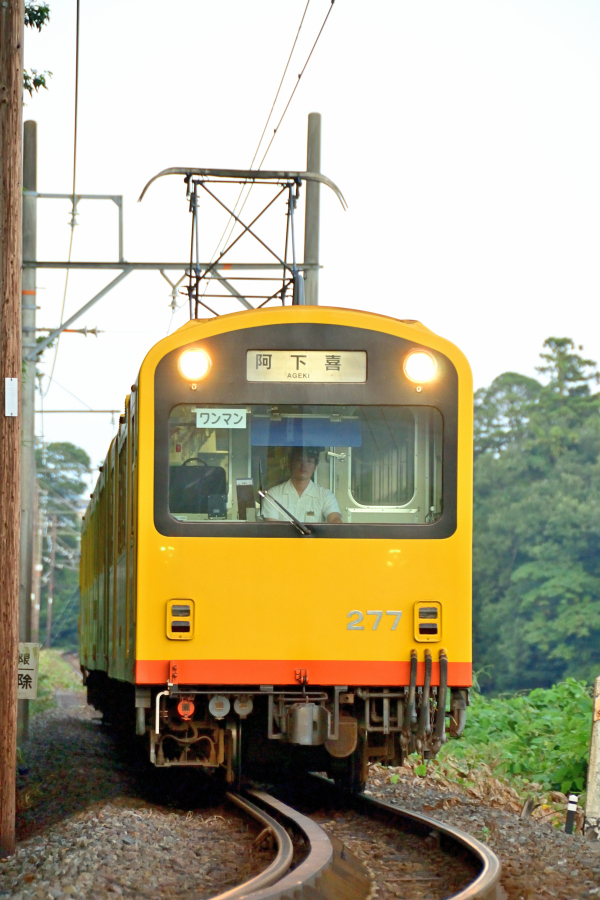 | No.D200_090830‐100 2009年8月30日 K77編成 クモハ277形 277他 4両 阿下喜行 三岐鉄道北勢線 麻生田←楚原 阿下喜 クモハ277‐サハ201=サハ101=クハ202 西桑名 下笠田八幡神社参道の踏み切りから。連接車3両を引き連れ阿下喜に向かうクモハ277。1990年に1両だけ増備された車両で前面のピラーが無くなってすっきりしています。 |