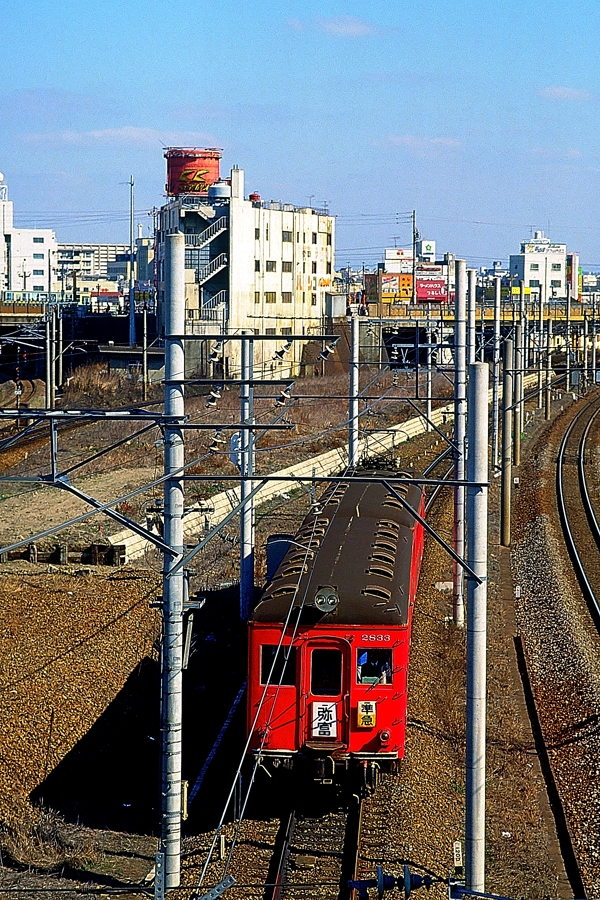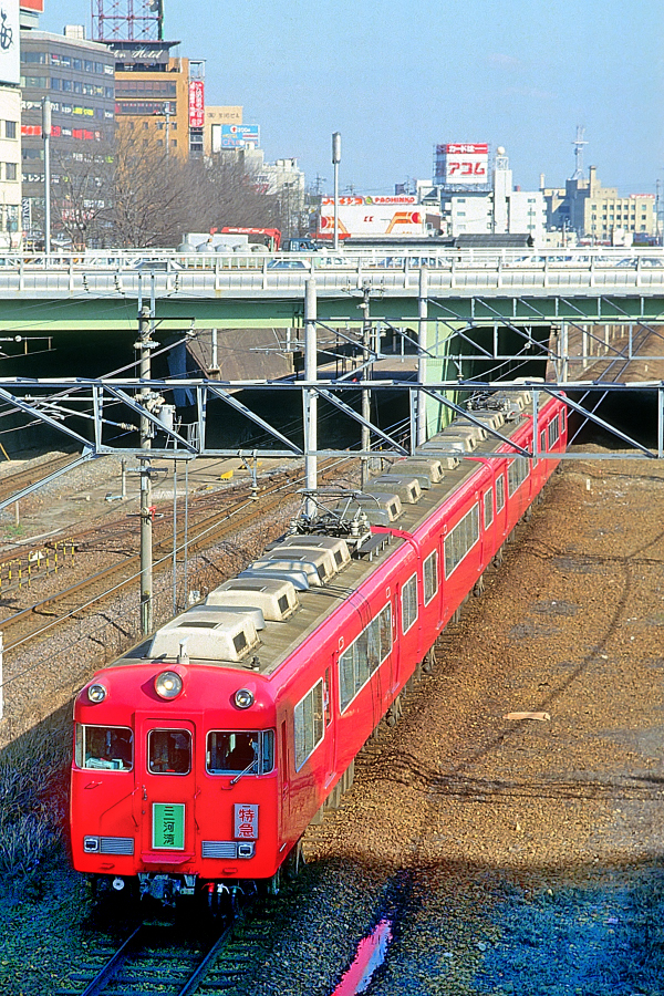 | No.143‐26 1987年3月8日 3400系 3401F ク2401他 4両 普通 豊明行 名古屋本線 ナゴヤ球場前(山王)→金山橋(金山) 豊明 モ3401‐サ2451‐モ3451‐ク2401 新岐阜 豊明行きに充当される3400系,いもむしの愛称で親しまれました。1989年には橋の後ろに金山橋駅が移転しJR中央本線,東海道本線,市営地下鉄が一体となった金山総合駅が誕生しています。 |