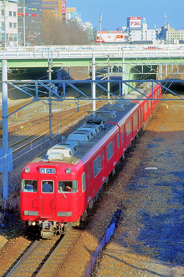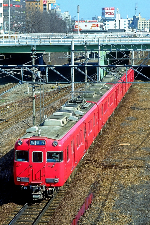 | No.143‐29 1987年3月8日 6000系 モ6200形他 4両 普通 常滑行 名古屋本線 ナゴヤ球場前→金山橋 常滑 ク6000形‐モ6300形‐サ6100形‐モ6200形 新岐阜 普通常滑行きに充当される6000系4連。 |