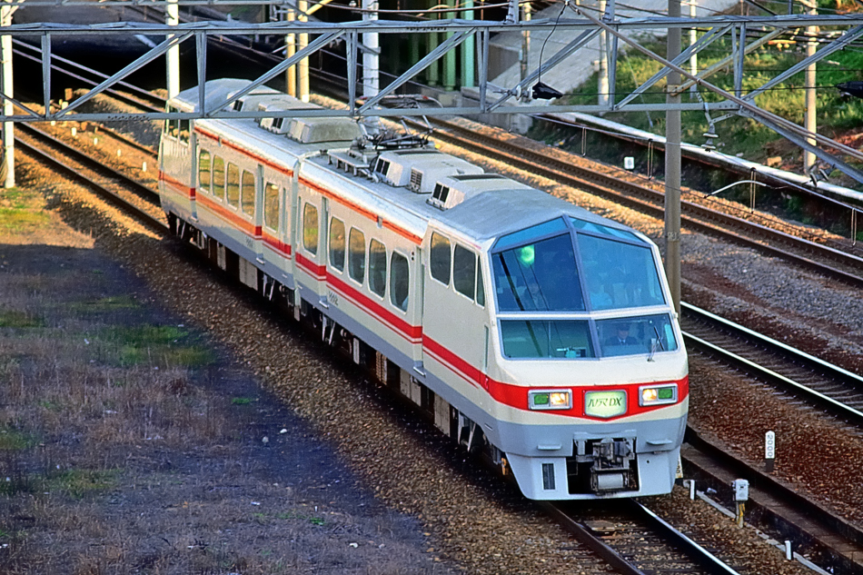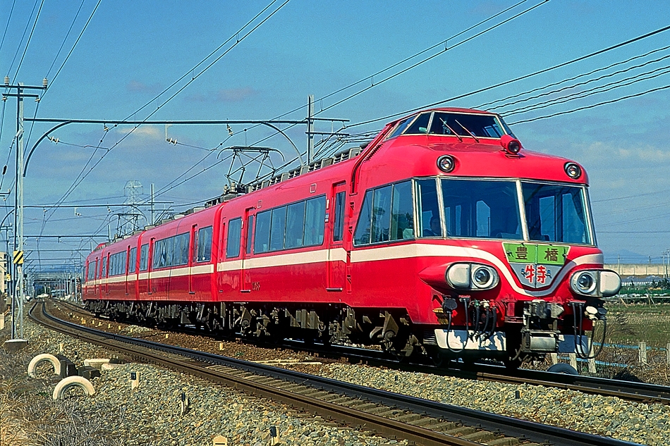 豊橋 モ8801‐モ8802 新岐阜 4枚で構成された正面窓の他,大きなRを持つ客室窓にも特徴を持つパノラマDX。ホワイトを基調とした塗色も,スカーレット一色の当時としては注目でした。 (2024/04/26シャドー調整) |