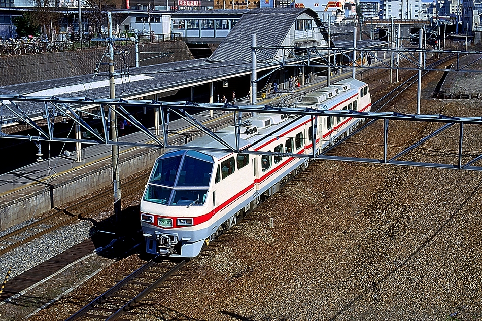 | No.143‐22 1987年3月8日 7000系 モ7000形他 4両 特急 内海行 名古屋本線 ナゴヤ球場前→金山橋 内海 モ7000形‐モ7050形‐モ7050形‐モ7000形 新岐阜 神宮前から河和線を通り知多半島,内海まで入る7000系白帯車4連の特急。国鉄中央本線の103系と113系も見えます。 |