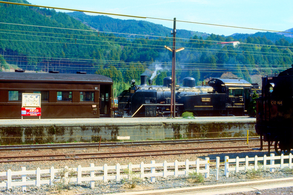 C11227がバック運転する[かわね路]とC12164。1973年に千頭にやってきたC12164は当初静態保存されていましたが,動態復元工事を受けて1976年7月から[かわね路]の予備機として運用されました。写真撮影翌月の1984年5月から休車となり,1987年に日本ナショナルトラストが購入,トラストトレインの牽引で運用を再開しました。 C12164 略歴 |