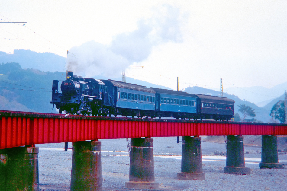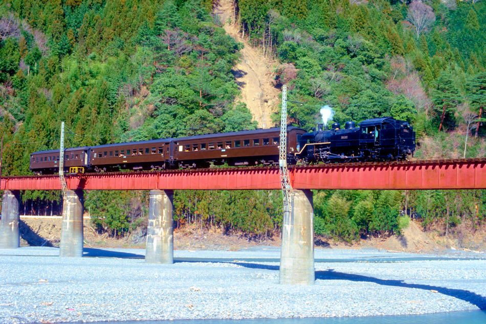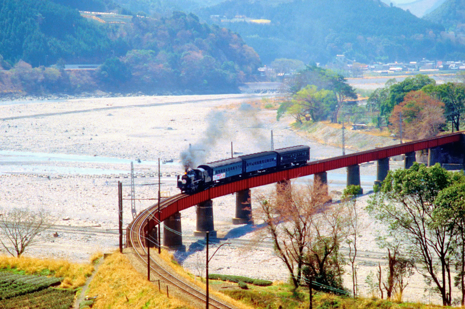 金谷 オハフ33 469-オハ35 2559-オハ35 2857+C5644 千頭 大井川第一橋梁からのカーブを曲がってきたC5644牽引の急行 ![]() |