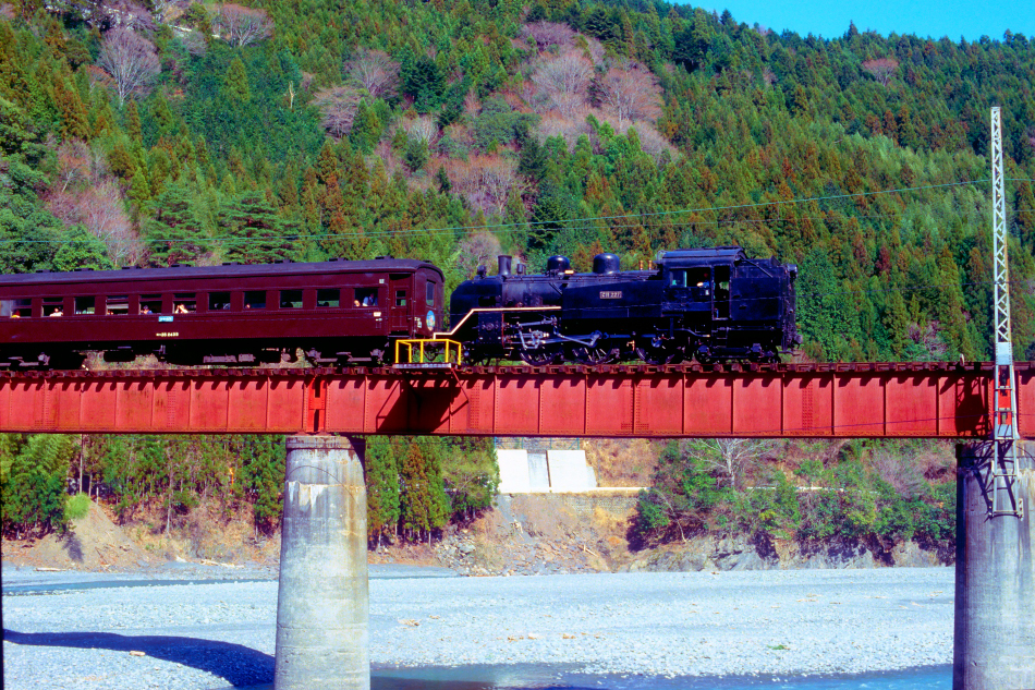 金谷 オハフ33 469-オハ35 2559-オハ35 2857+C5644 千頭 旧型客車3両を牽引して大井川第一橋梁を渡るC5644。 |