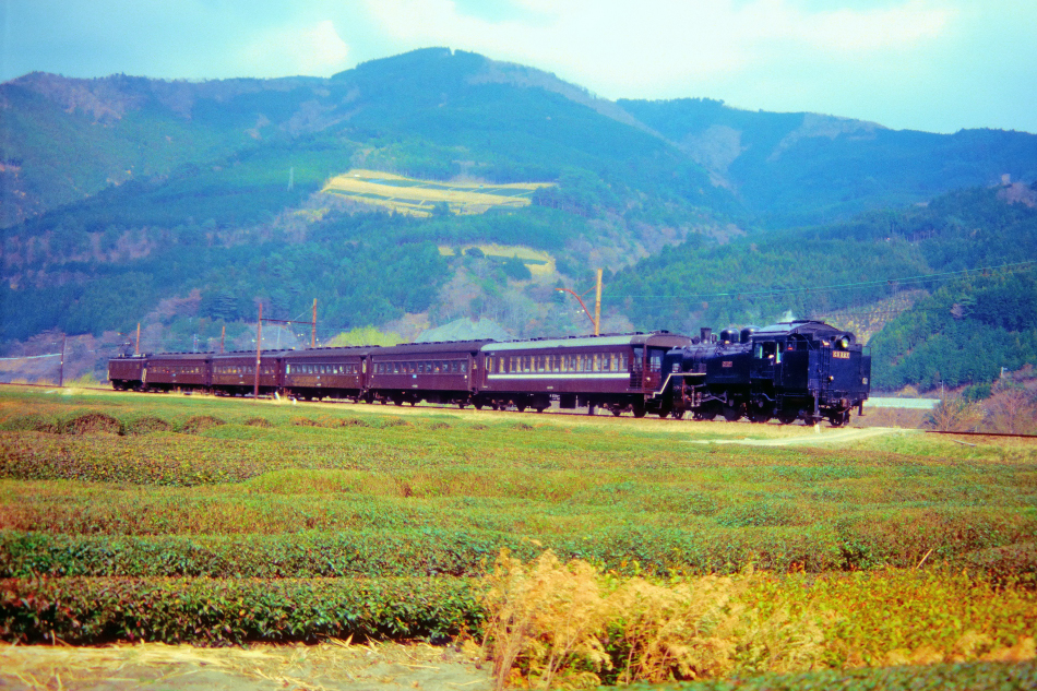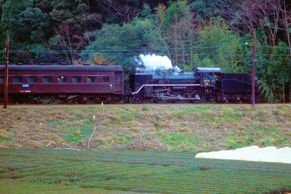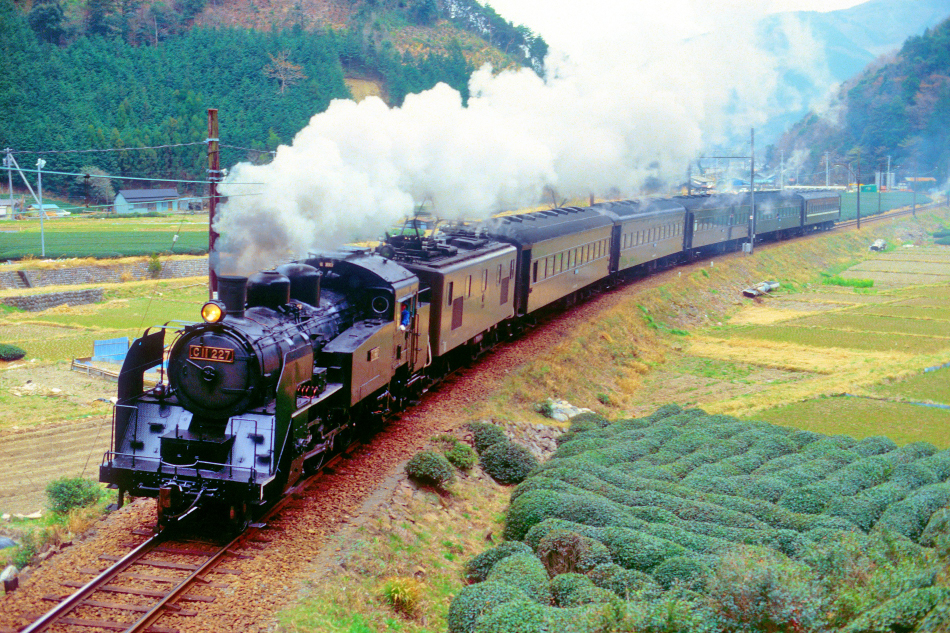金谷 C11227逆+スイテ821‐オハ35 2022‐オハ35‐オハ35 2149‐オハフ33 2215+E101 千頭 山間部の茶畑を快走するPP編成 |