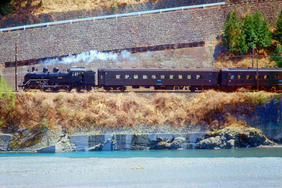 | No.47-15 1984年4月8日 C11 227+客車5両+E101 急行 かわね路 千頭行 大井川本線 塩郷←地名 |