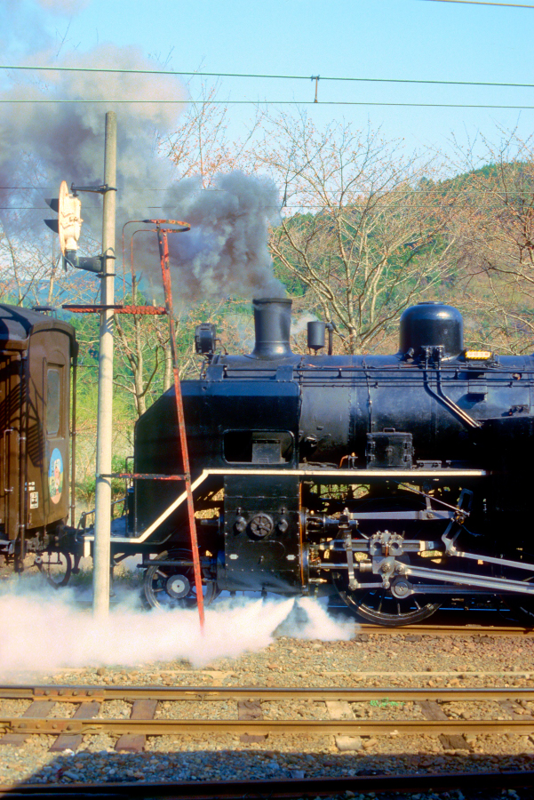 | No.48-11 1984年4月8日 C11 227+客車5両+E101 急行 かわね路 金谷行 大井川本線 家山 金谷 C11227逆+オハ35 2435-オハ35 2022-オハ35-オハ35 2149‐オハフ33 2215+E101 千頭 ドレーンの蒸気を吐き家山の出発信号機を通過するC11227 |