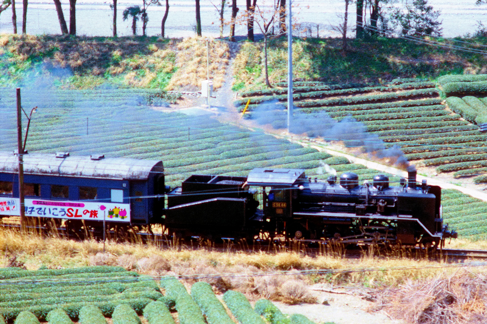 金谷 C5644逆+オハフ33 469-オハ35 2559-オハ35 2857 千頭 バック運転で茶畑地帯を走るC5644。 |