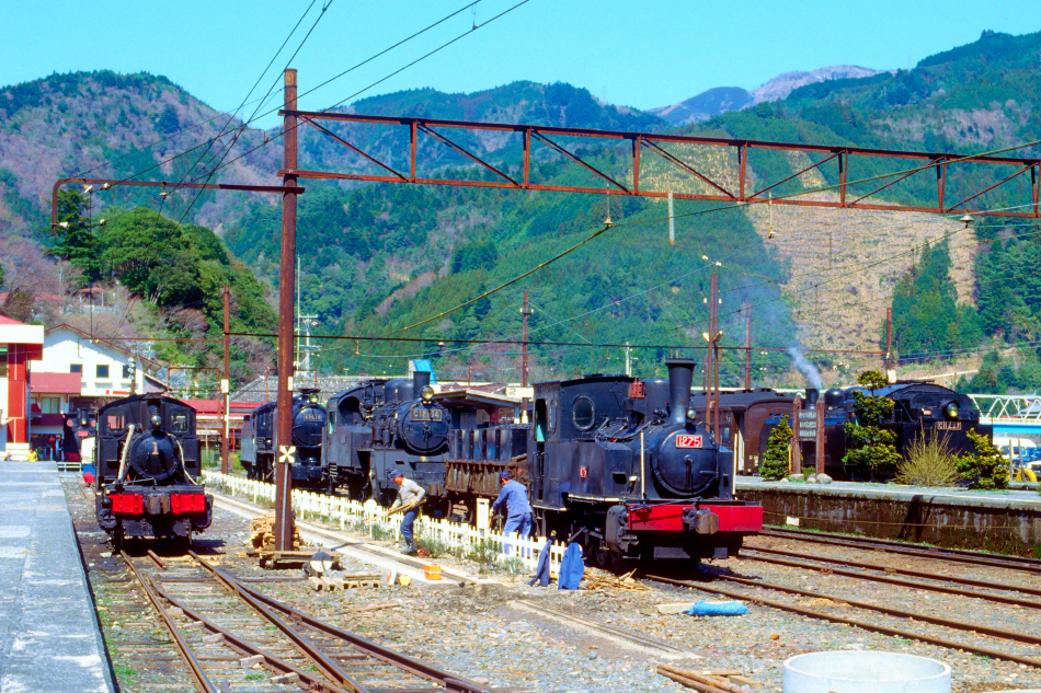| No.44-10 1984年4月6日 1号 [いずも] 大井川本線 千頭 動態復元され千頭で展示されていた頃の1号[いずも]。1922年コッペル社製のCタンク機。煙突は井川線入線のためオリジナルより切り詰められていました。左後方は2109,右側はC12164。 1号[いずも] 略歴 |