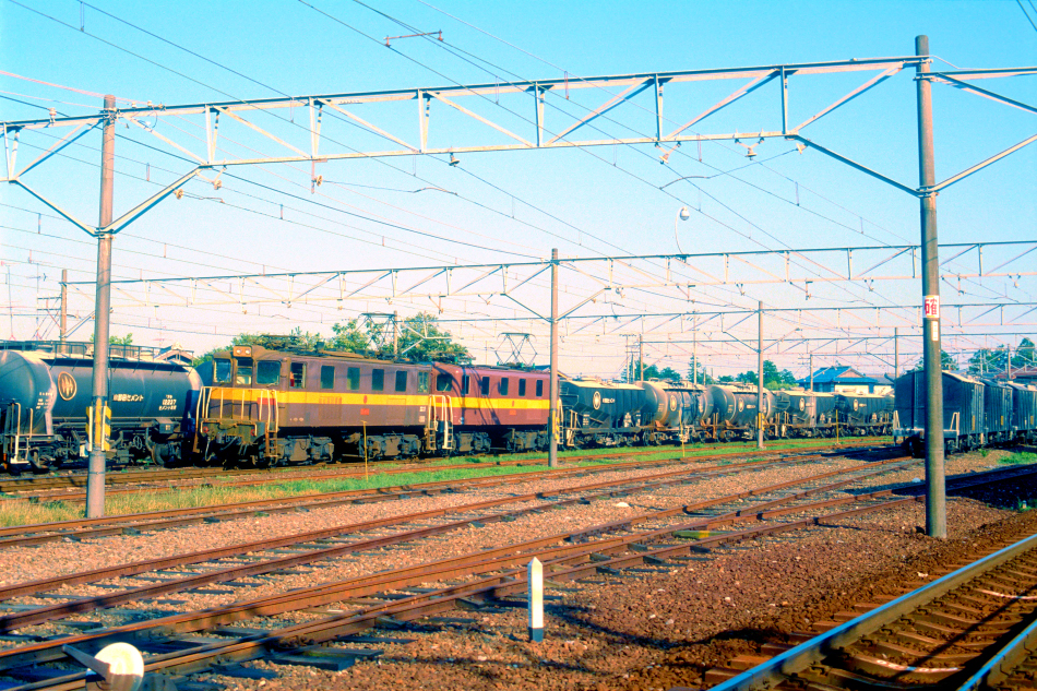 東藤原 ED456+ED455+ホキ15773+タキ1900形x2+ホキ5700形x3+・・・ 富田 ED45は全て重連総括制御に改造されており,ホキ5700やタキ1900で編成された長大なセメント輸送列車を重連で牽引しています。なお,この時代は小野田セメントであり,1994年に秩父セメントと合併し秩父小野田株式会社となり,さらに1998年に日本セメントと合併し太平洋セメント株式会社となっています。 |