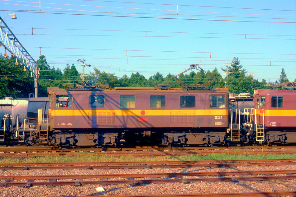 東藤原 ED456+ED455+ホキ15773+タキ1900形x2+ホキ5700形x3+・・・ 富田 真横から。左のED456は3次型で,運転室窓,側面窓,前面窓,側面通風口,デッキなどに違いが見られます。 |