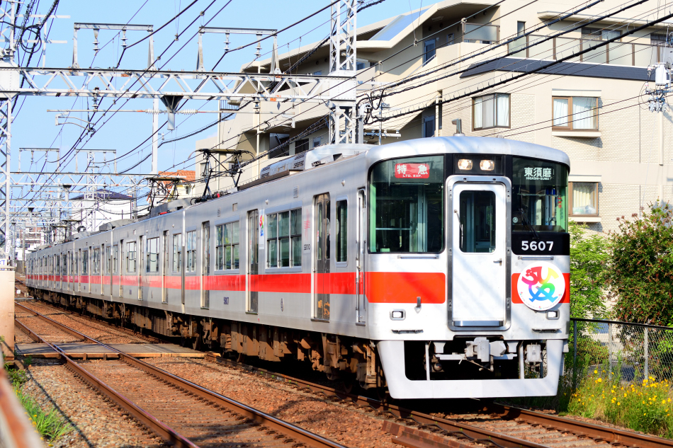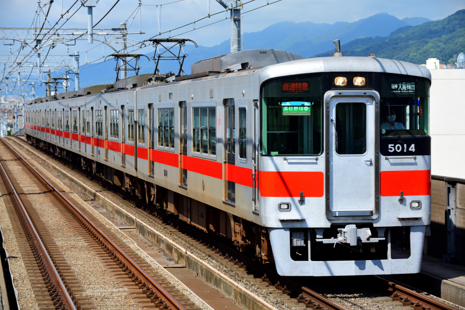 梅田 5014‐5015‐5510‐5208‐5209‐5607 東須磨 こちらは珍しく東須磨行きの特急として運転される5014F。5208と5209は1995年の4→6両化に際し組み込まれた増結車で,5030系と同様の幅広窓となっています。の (2024/07/09追加) |