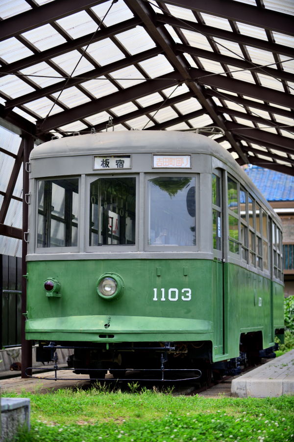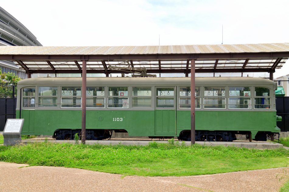 | No.D850_240629-170 2024年6月29日 1100形 1103号 御崎公園 1971年に神戸市電が廃止された後,広島電鉄に委譲され行先方向幕などの改造を受けています。大型ワイパーやバックミラーも取り付けられています。 |