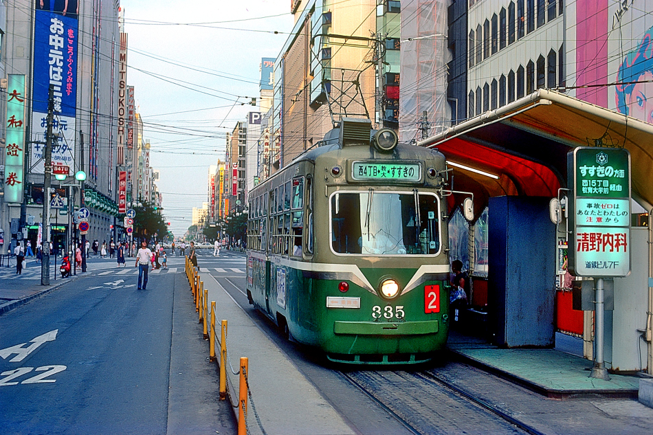 三越前の西4丁目駅が1条線の始点だった頃,発車を待つ335号。335号は1958年4月に日立製作所で製造されたボギー車で,丸みの強い正面窓1枚のスタイルはその後に登場した210形以降の道産電車の基になりました。 (2024/05/18シャドー調整) ![]() |