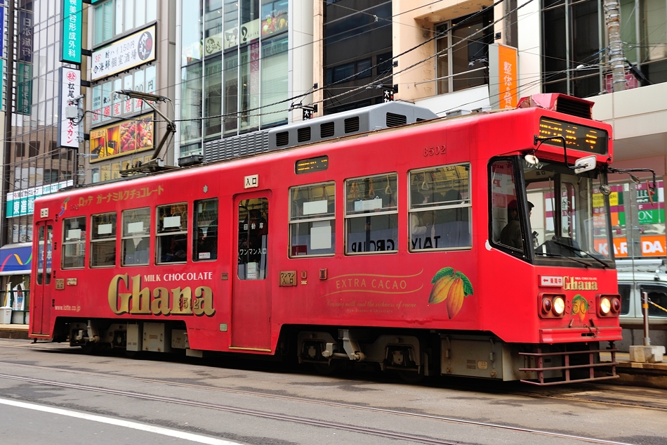 8500形のラッピング電車。8500形は1985年製で,熊本市電8200形に次いで2番目となるVVVFインバータ制御車で,8501・8502の2両があります。 | ||||||||||||||||||||||||||||||||||||||||||||||||||||||||||||||||||||||||||||||||||||||||