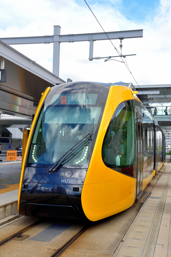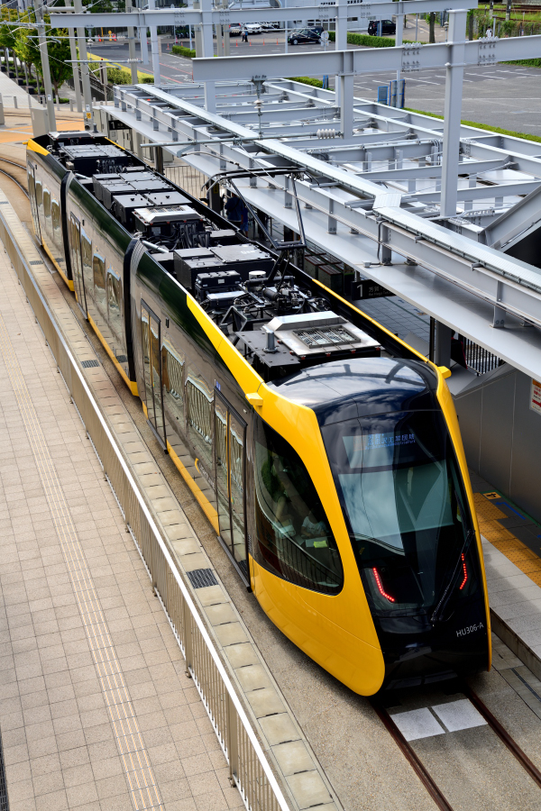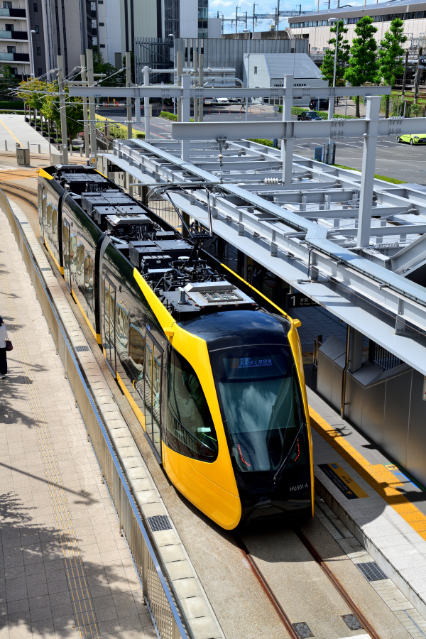 | No.D850_240915‐002 2024年9月15日 HU301‐A他 3両 各停 宇都宮駅東口行 宇都宮芳賀ライトレール線 宇都宮駅東口 宇都宮駅東口に到着したHU‐300形。写真は17本あるうちの第1編成で手前がHU301‐A,中間車がHU301‐C,後ろ側がHU301‐Bの3両連接固定編成となっています。 |