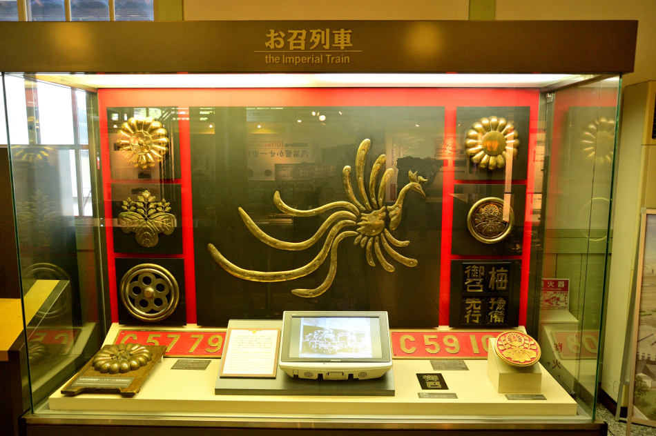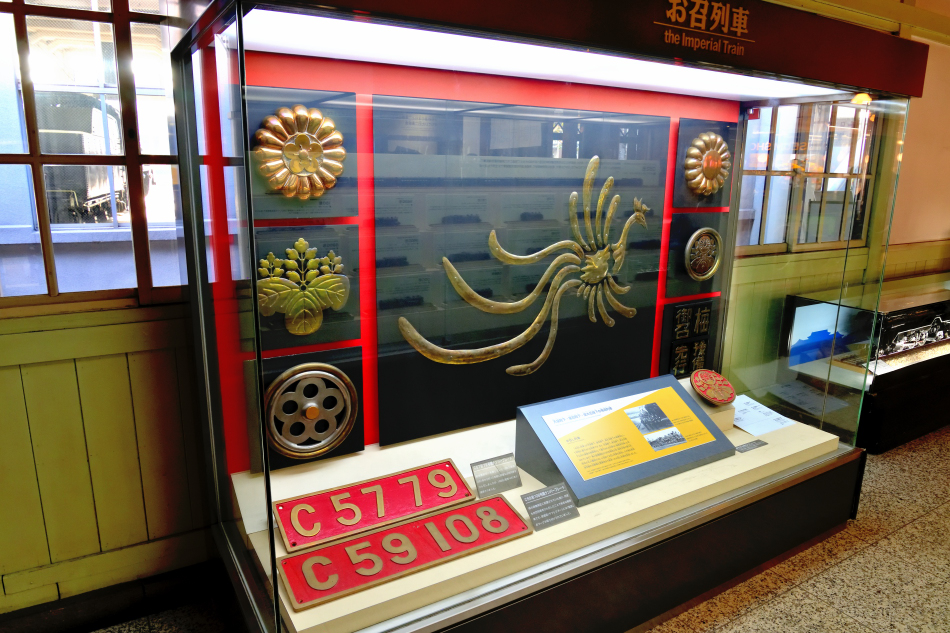 旧二条駅舎内に展示されている梅小路機関区所属蒸気機関車用お召列車用装飾品。主要幹線におけるお召列車牽引機は戦前はC51形が使用され,その後C57形,最後はC59形が使用されました。赤地のナンバープレート,デフの鳳凰,国旗交差部の紋章,区名札,仕業札などお宝の山。 (2024/05/26追加) |